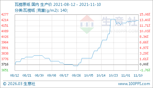 11月10日瓦楞紙4214.00元/噸 60天上漲12.27%