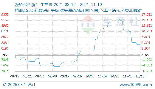 11月10日滌綸FDY價格8341.43元/噸 60天上漲10.09%