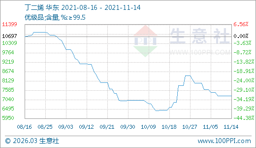 11月14日丁二烯7253.33元/噸 30天上漲12.88%