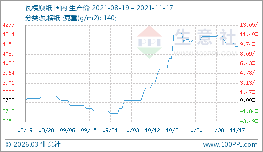 11月17日瓦楞紙4142.00元/噸 60天上漲11.34%