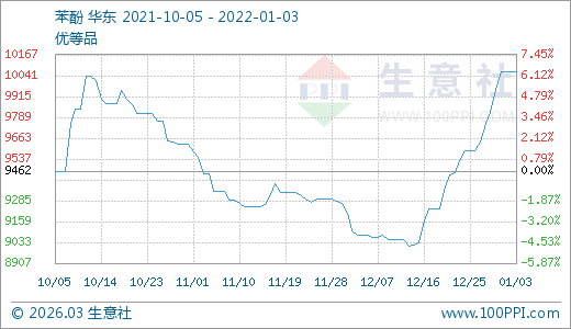 01月03日苯酚9980.00元/噸 15天上漲10.03%