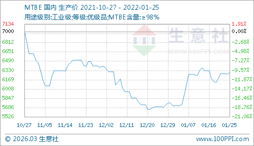 01月25日MTBE價(jià)格6300.00元/噸 30天上漲10.53%