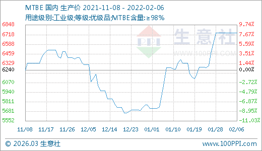 02月06日MTBE價(jià)格6740.00元/噸 15天上漲7.39%
