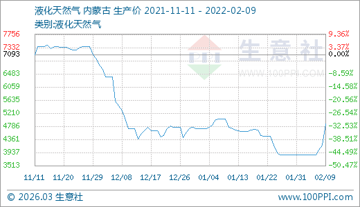 液化天然氣02月09日最新價格4866.67元/噸,最近5天上漲25.86%。