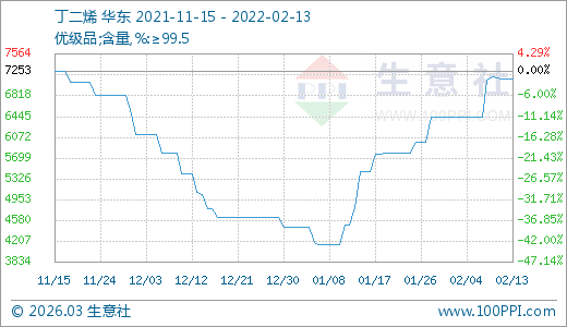 丁二烯02月13日最新價格7121.25元/噸,最近10天上漲10.64%,20天上漲22.86%,30天上漲30.76%,60天上漲48.57%。