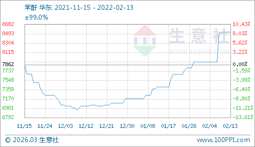 02月13日苯酐8525.00元/噸 10天上漲7.57%