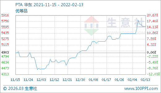 02月13日PTA價(jià)格5613.00元/噸 60天上漲21.26%
