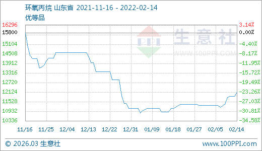 環(huán)氧丙烷02月14日最新價格12100.00元/噸,最近5天上漲6.45%,10天上漲7.08%,30天上漲11.01%。