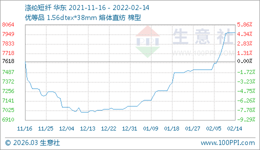 滌綸短纖02月14日最新價格7968.33元/噸,最近10天上漲5.99%,60天上漲13.67%。