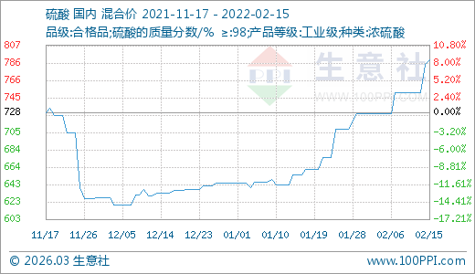 02月15日硫酸790.00元/噸 5天上漲5.10%