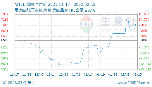 02月15日MTBE價(jià)格7120.00元/噸 5天上漲3.94%