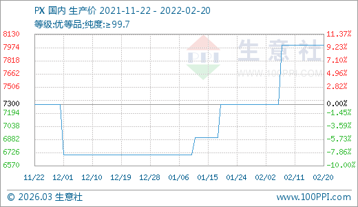 PX 02月20日最新價格8000.00元/噸,最近15天上漲9.59%,60天上漲19.40%。
