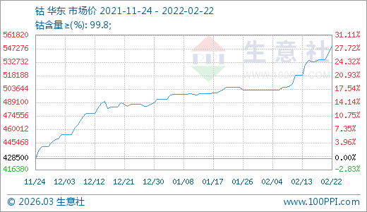鈷02月22日最新價格549700.00元/噸,最近5天上漲3.08%,10天上漲6.04%,15天上漲8.77%,60天上漲12.78%。