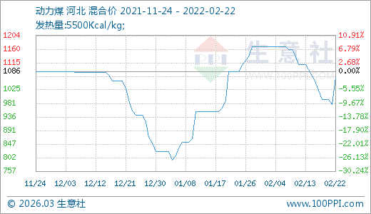 02月22日動力煤1055.00元/噸 60天上漲11.94%