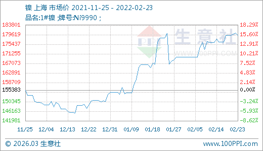 02月23日鎳179183.33元/噸 60天上漲18.66%