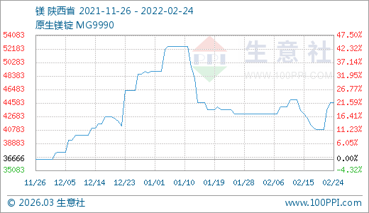02月24日鎂44666.67元/噸 5天上漲9.39%