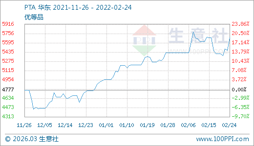 02月24日PTA價(jià)格5685.50元/噸 5天上漲5.24%