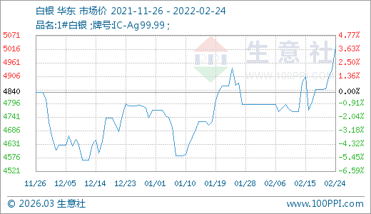 02月24日白銀5025.33元/千克 5天上漲3.53%