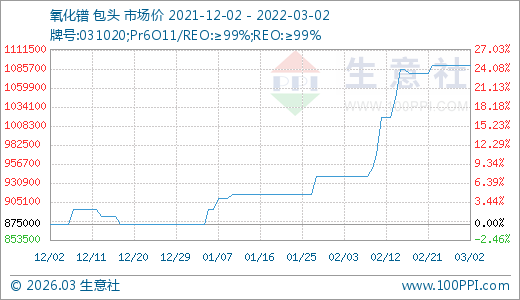 氧化鐠03月02日最新價格1090000.00萬元/噸,最近20天上漲12.37%,30天上漲15.96%,60天上漲24.57%。