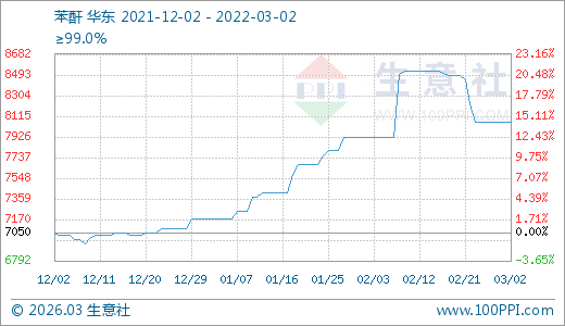 03月02日苯酐8062.50元/噸 60天上漲12.37%