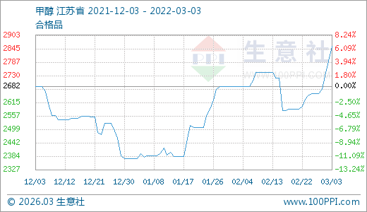 03月03日甲醇2855.00元/噸 5天上漲7.63%