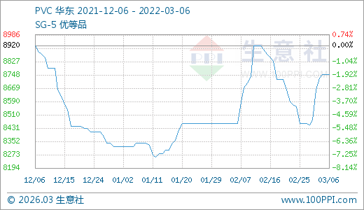 03月06日PVC價(jià)格8750.00元/噸 5天上漲3.18%