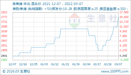 03月07日煉焦煤2785.00元/噸 5天上漲6.77%