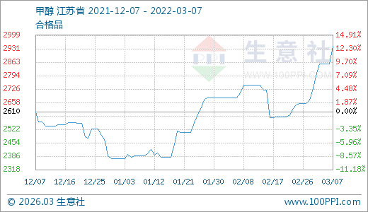 03月07日甲醇2942.50元/噸 5天上漲5.37%