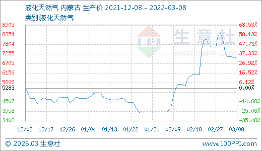 液化天然氣03月08日最新價格7090.00元/噸,最近20天上漲19.23%,30天上漲83.36%。