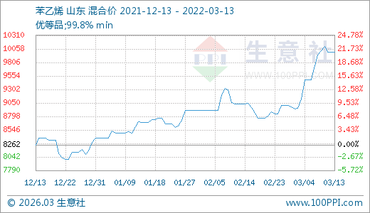 03月13日苯乙烯10000.00元/噸 10天上漲9.65%