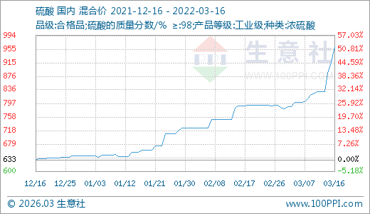 03月16日硫酸961.67元/噸 5天上漲15.63%