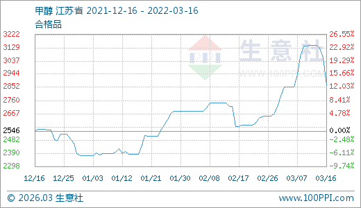 03月16日甲醇2862.50元/噸 60天上漲20.15%