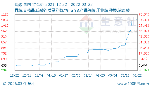 03月22日硫酸1076.67元/噸 5天上漲11.77%