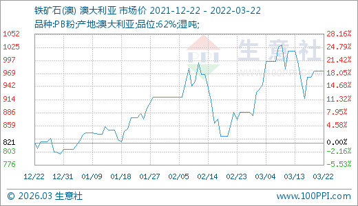 03月22日鐵礦石975.44元/噸 30天上漲16.60%