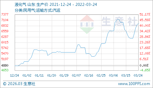 液化氣03月24日最新價格6960.00元/噸,最近5天上漲11.72%,30天上漲25.72%。