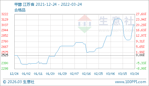 03月24日甲醇3040.00元/噸 5天上漲9.06%