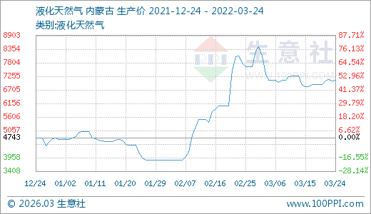 液化天然氣03月24日最新價格7096.00元/噸,最近60天上漲58.87%。