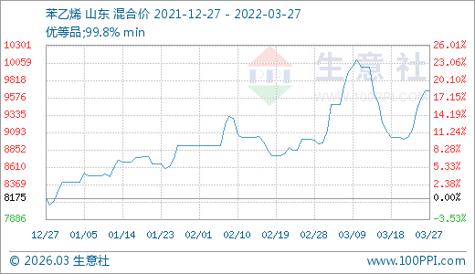 03月27日苯乙烯9675.00元/噸 5天上漲7.26%