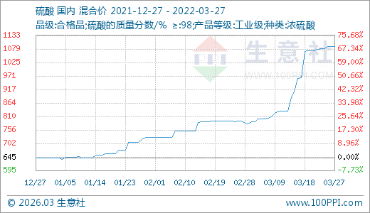 03月27日硫酸1088.33元/噸 10天上漲12.98%