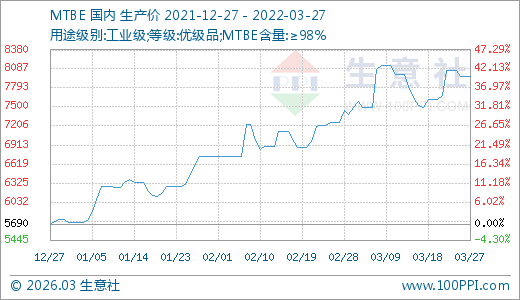 03月27日MTBE價(jià)格7975.00元/噸 10天上漲6.33%