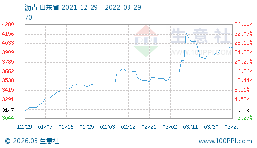 瀝青03月29日最新價格3977.20元/噸,最近30天上漲11.49%,60天上漲13.73%。
