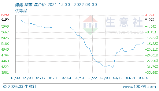 03月30日醋酸5250.00元/噸 10天上漲7.14%