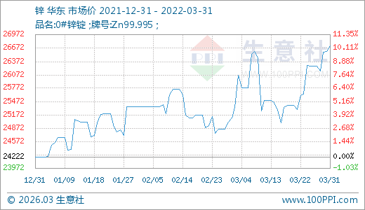03月31日鋅26722.00元/噸 10天上漲5.69%