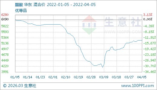 04月05日醋酸5260.00元/噸 30天上漲22.84%