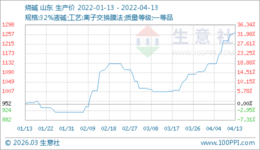 04月13日燒堿1264.00元/噸 10天上漲12.06%