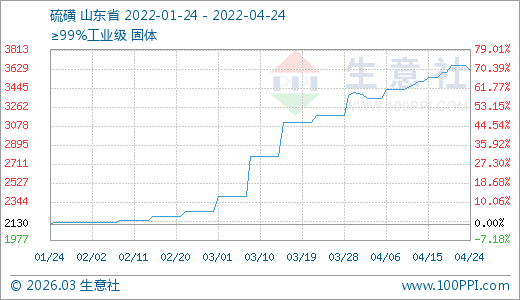 04月24日硫磺3616.67元/噸 30天上漲13.61%