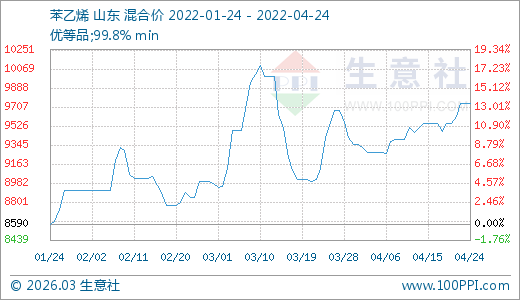 04月24日苯乙烯9737.50元/噸 60天上漲10.15%