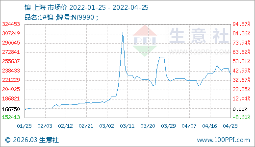 04月25日鎳231183.33元/噸 60天上漲28.60%