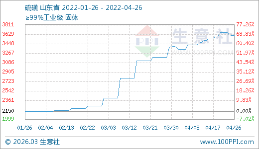 04月26日硫磺3603.33元/噸 30天上漲13.19%