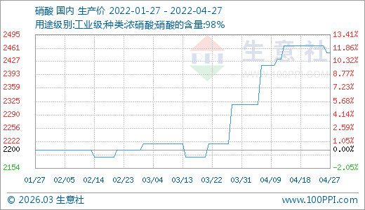 04月27日硝酸2450.00元/噸 60天上漲11.36%